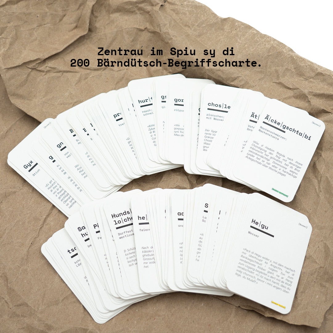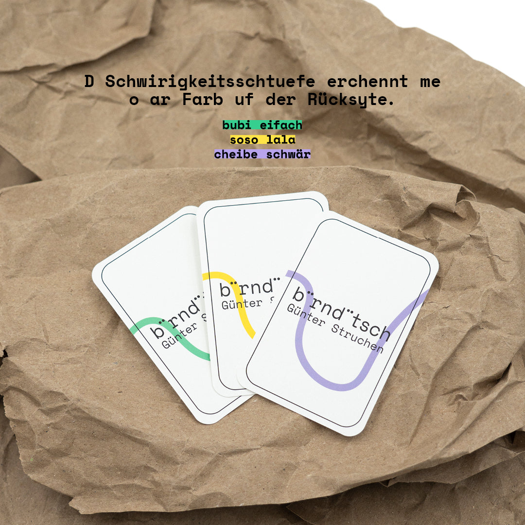Für dieses Produkt haben wir mit Günter Struchen zusammengespannt. Unser Ziel war es, ein Spiel zu kreieren, das das Bärndütsch-Vokabular erweitert, Wörter in Erinnerung ruft und vor allem eins: Spass macht! Aus dieser Idee entstand nicht nur ein Spiel, sondern fünf – alles vereint in einer Spielbox.