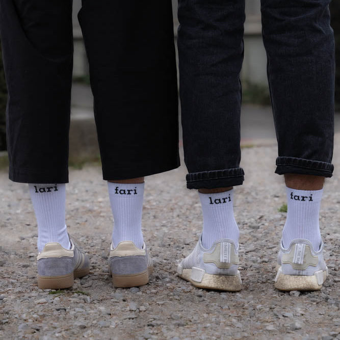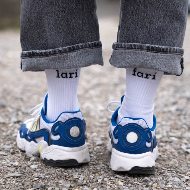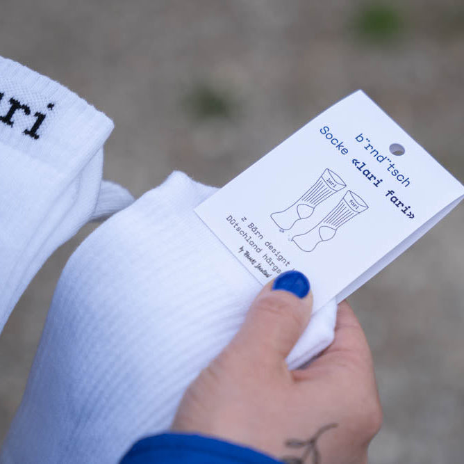 Wir lieben den berndeutschen Dialekt und sammeln schon seit langer Zeit unsere Lieblingsbegriffe. Nun fanden wir, es ist Zeit, einen dieser Begriffe auf unsere eigenen Socken zu sticken – und wir haben uns für den Begriff «lari fari» entschieden. Dieser Ausdruck gefällt uns sehr. Wenn auch du etwas mehr «lari fari» in deinem Leben verträgst, sind diese Socken perfekt für deinen Kleiderschrank.